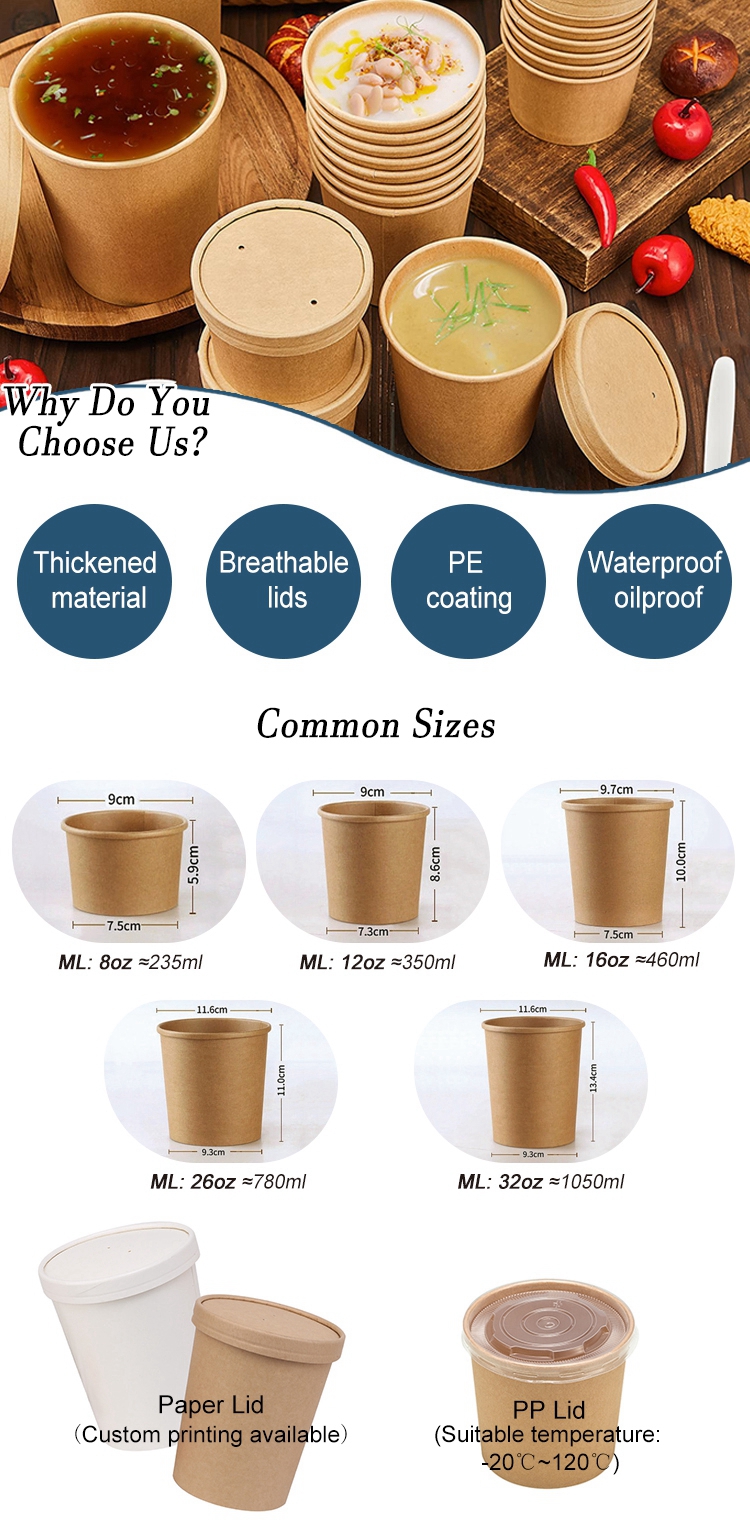 Our paper soup containers are made of high-quality pulp material, which is not easy to crack and can come into direct contact with food. Overall, they have excellent leak proof performance.